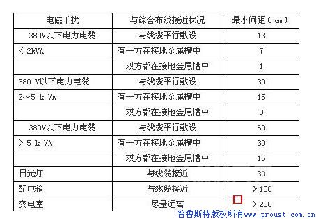 在綜合布線工程中與電磁干擾源相遇是很平常的事情。一般可按表1中所指出的距離處理。原則上應(yīng)該是盡量遠(yuǎn)離,實(shí)在離不開時(shí)可采取屏蔽措施。