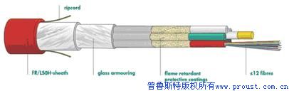 玻璃纖維鎧裝光纜阻燃、低煙、無毒、防水、防鼠、耐火(光纜護套和防火穩(wěn)定元素確保光纜在850攝氏度的火場中能夠繼續(xù)保持正常傳輸180分鐘 — 線路完整性,符合IEC 60331系列標準,而在最嚴格的系統線路完整性檢測中仍然可以超過30分鐘/850攝氏度 — 德國標準:DIN 4102-12)。能廣泛應用于隧道、地鐵、銀行、保險公司、大型工廠和網絡主干等重要場合。